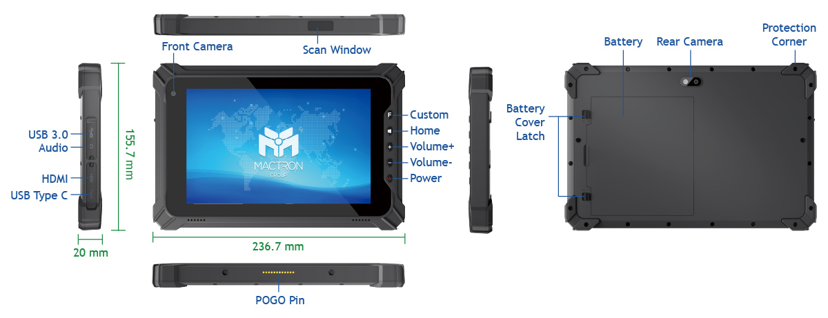 1 x USB 3.0 Type A 1 x USB Type C 1 x HDMI 1.4a Type C 1 x 3.5mm standard earphone jack 1 x TF slot (Max.128GB) (SDHC/SDXC) 1 x SIM slot 1 x 12pin POGO pin |