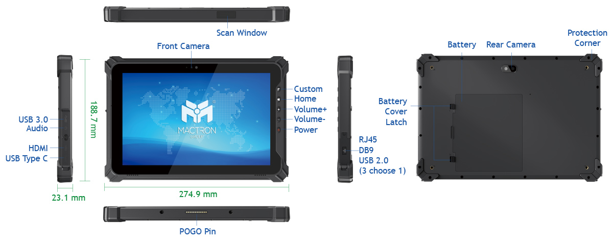 1 x USB 3.0 Type A 1 x USB Type C 1 x HDMI 1.4a Type C 1 x 3.5mm standard earphone jack 1 x TF slot (Max.128GB) (SDHC/SDXC) 1 x SIM slot 1 x DC jack 1 x 12pin POGO pin 1 x LAN Port (Optional COM (RS232) or USB2.0 Type A with MOQ) |