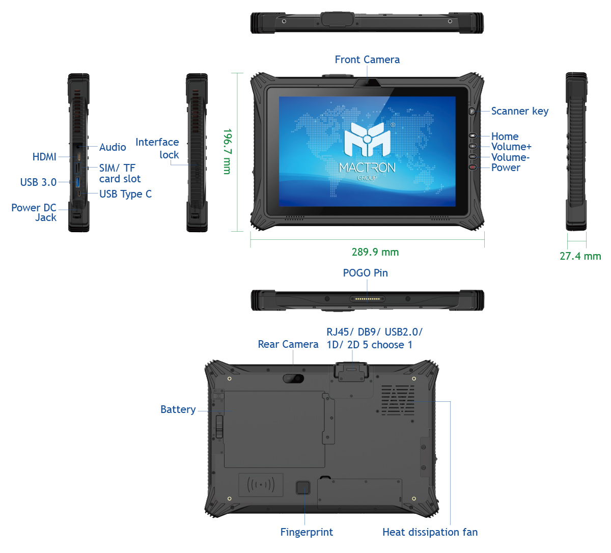 1 x USB3.1 Type-A 1 x USB Type C 1 x 3.5mm Standard Earphone Jack 1 x SIM card 1 x TF card 1 x HDMI 2.1a mini 1 x DC jack 1 x 12PIN Pogo Pin |